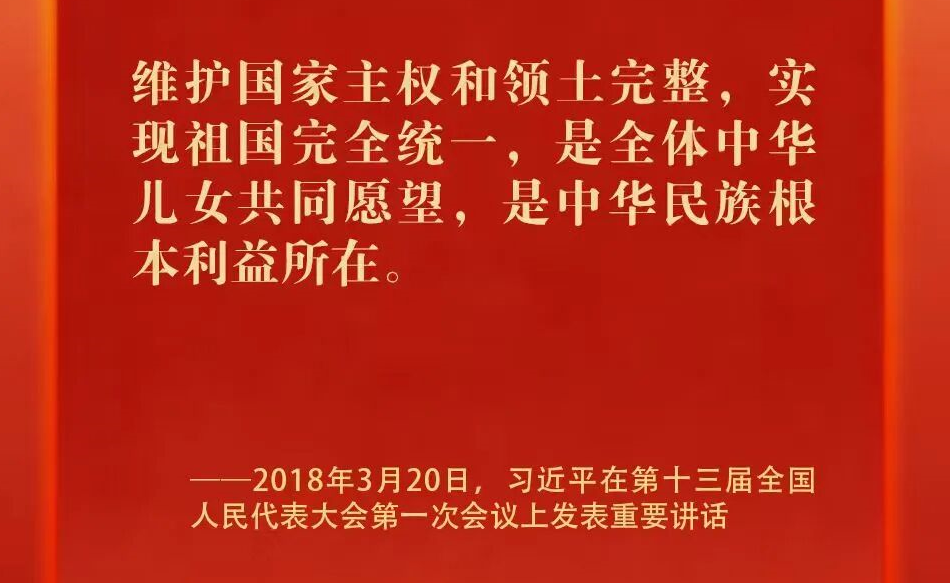 维护国家主权和领土完整,实现祖国完全统一,是全体中华儿女共同愿望,是中华民族根本利益所在。